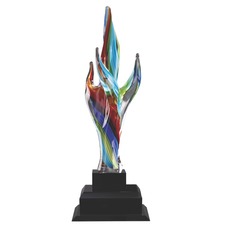 This 15" Art Glass Multi Color Twisting and Turning Torch is the perfect award for any occasion. With its stunning design and unique twisting and turning shape, it will be a centerpiece on any desk or shelf. The two black bases provide a stable and elegant display. Make a statement with this beautiful piece. Overall height is 19.25".