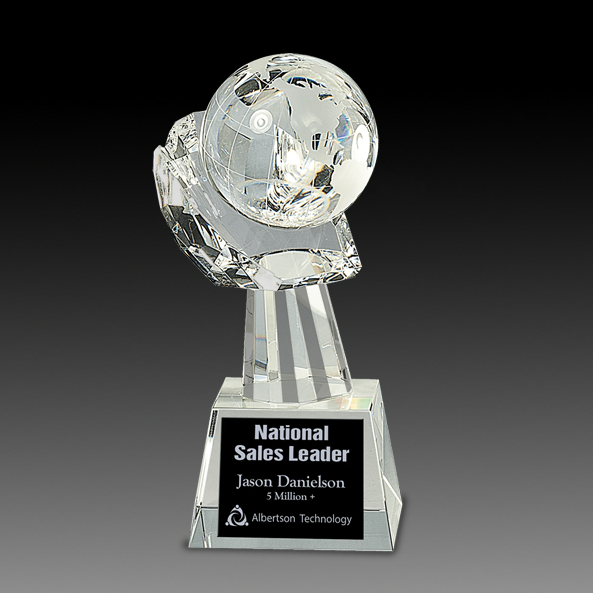 This award is perfect for recognizing global reach. The elegant globe, made of crystal, is perched dramatically in a crystal hand. The combination gives us a heavy award.. A plate is included for lettering and logo. A well-built gift box is included.