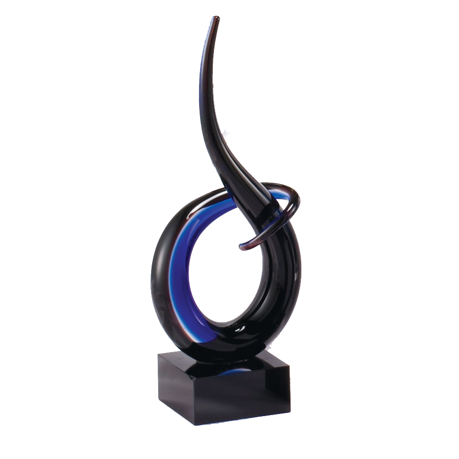 Expertly crafted by skilled artisans, this 9.5" Art Glass Sculpture boasts a mesmerizing blend of blue and black hues. Perfect for adding an elegant touch to any space, this sculpture is a true work of art. Display it proudly and marvel at its intricate details.