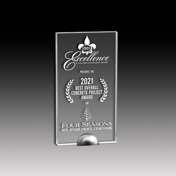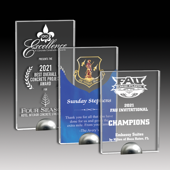 Crafted from durable 3/8" acrylic, this upright award features a sleek chrome metal base that adds a touch of modern elegance. Available in three sizes, it suits a variety of recognition needs, offering a professional and sophisticated presentation for any achievement.