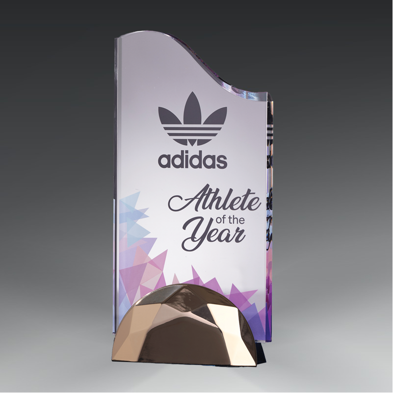 Experience the beauty and grace of our Acrylic Wave in Metal Base. This awe-inspiring award features a unique and striking design, with a sleek metal base. Available in two sizes and three base colors, this award is perfect for recognizing exceptional achievements. Add a touch of style and elegance to any awards ceremony or event with the Acrylic Wave in Metal Base. The base is also available in 2 shapes.