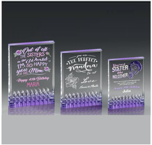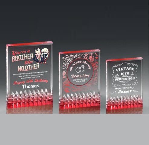 This acrylic is beautiful with the colorful jewel cuts across the bottom. If you are looking to shine a spotlight on and recognize your best achievers, this is the trophy for you. Available in 3 sizes and 4 colors: Blue, Gold, Red, and Purple.