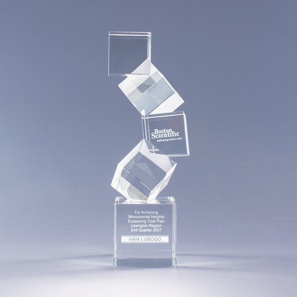 Named for the artful ballet posture, the Arabesque is an interesting play on cubes that appear to defy gravity as they ascend through space. Made of pure optic crystal, this contemporary sculpture shatters its surroundings and then reassembles it into an abstract design of cubist fashion. Tall, heavy, and eye-catching, this Theme-Award makes a statement about brilliant individuals whose vision and fire make the impossible possible.