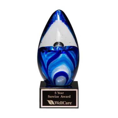 Art glass egg on black glass base. Laser engravable aluminum plate. These glass awards are packaged in satin-lined, padded gift boxes. Each piece of art glass is made by hand, air bubbles and color variations are common. 6.5"