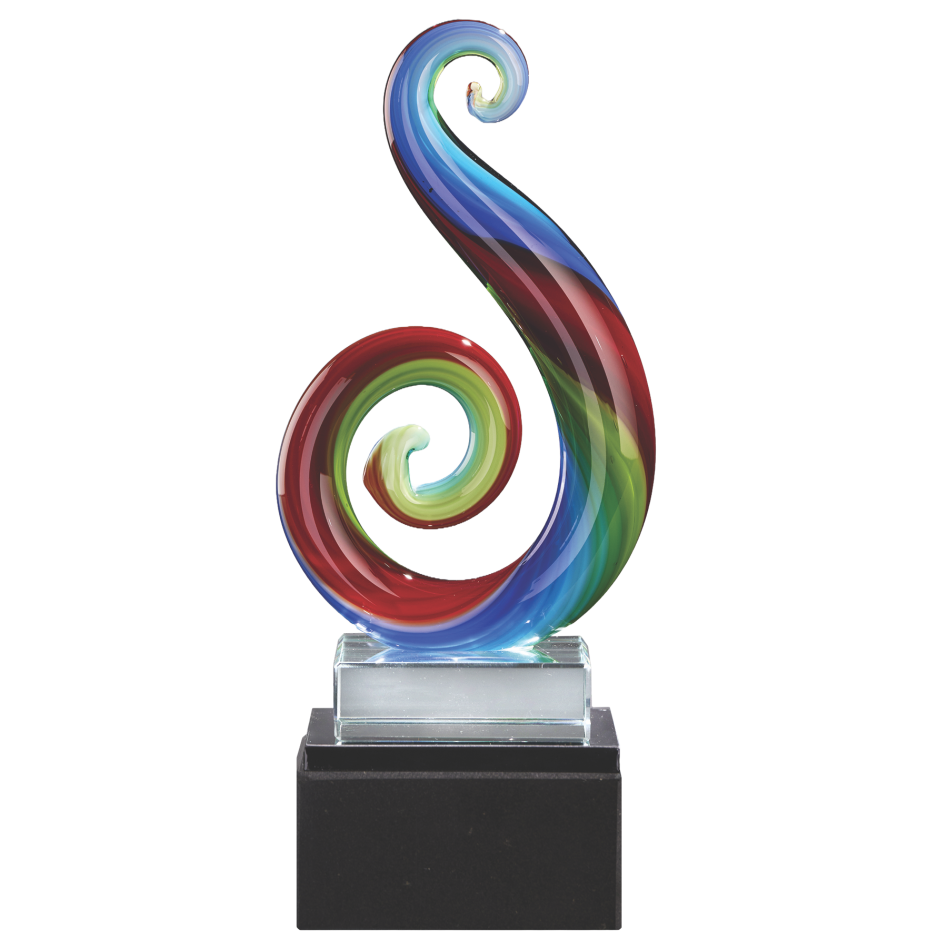 This exquisite art glass piece features vibrant multi-colored curley que designs delicately crafted atop a pristine clear glass base. Its striking combination of vivid hues and elegant form make it an outstanding decorative accent or a distinguished award. Expertly made, it showcases exceptional clarity and craftsmanship that elevate any display with both color and sophistication.