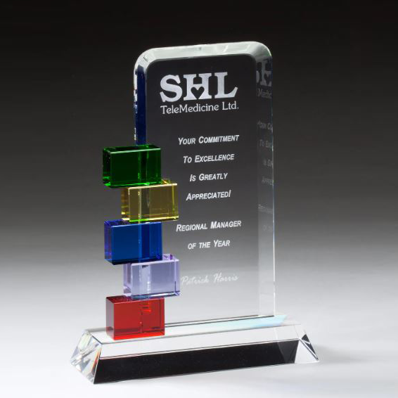 Recognize your top performers with our Billboard Glass Award. This sleek and modern award features colored blocks and comes in three sizes, perfect for any occasion. Show your appreciation with this stunning award.