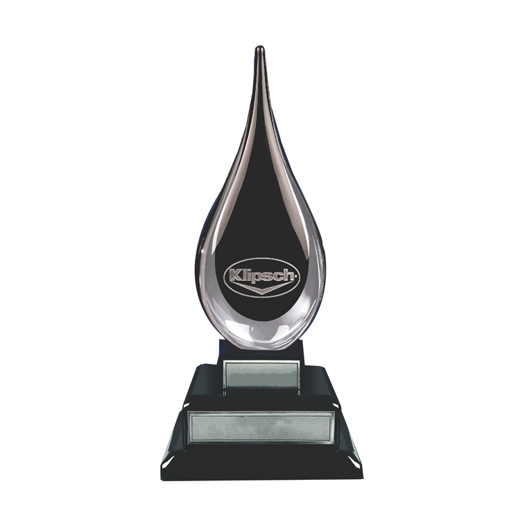 The simplicity of Black and Crystal come together to create this mysteriously prestigious design. The tear drop is attached to a black glass base (12"). Raise the stakes for that dauntless leader with added ebony base with the lustrous Piano Finish (15.5" overall). All of our art glass is hand-made to ensure that no two pieces are identical. Every award is a true "one of a kind" and bound to impress.