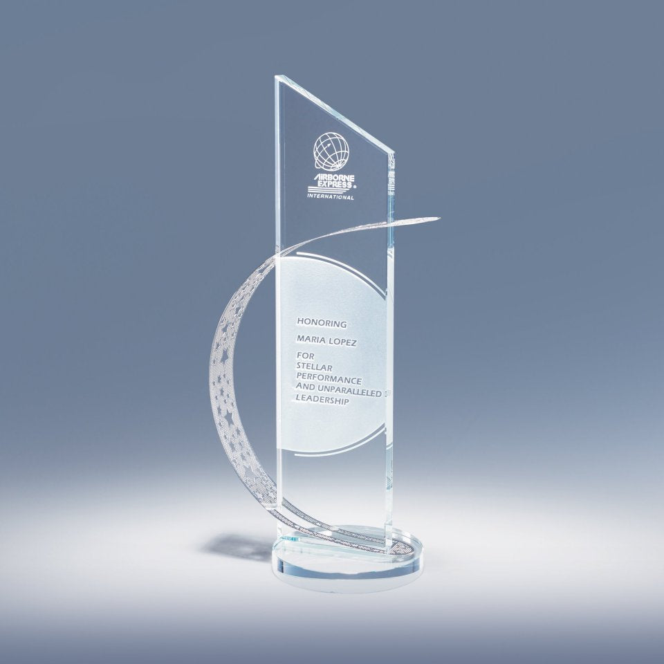 Like a true achiever, this award possesses sparkle and a sweeping motion that does well to symbolize the motivated path to one's success. Display in direct light and notice how images of the cut stars are sprayed about. Celestial is a Theme-Award that echoes the style of one for whom success and destiny are forever intertwined. A romance card elaborating this theme is included for your presentation.