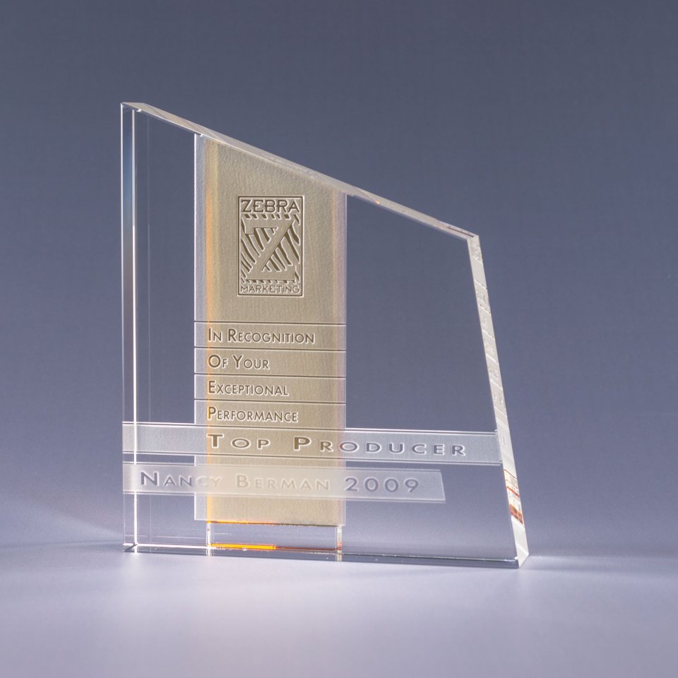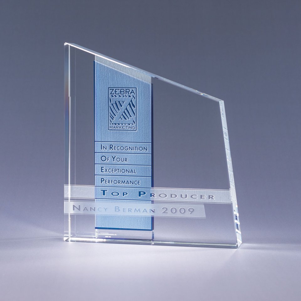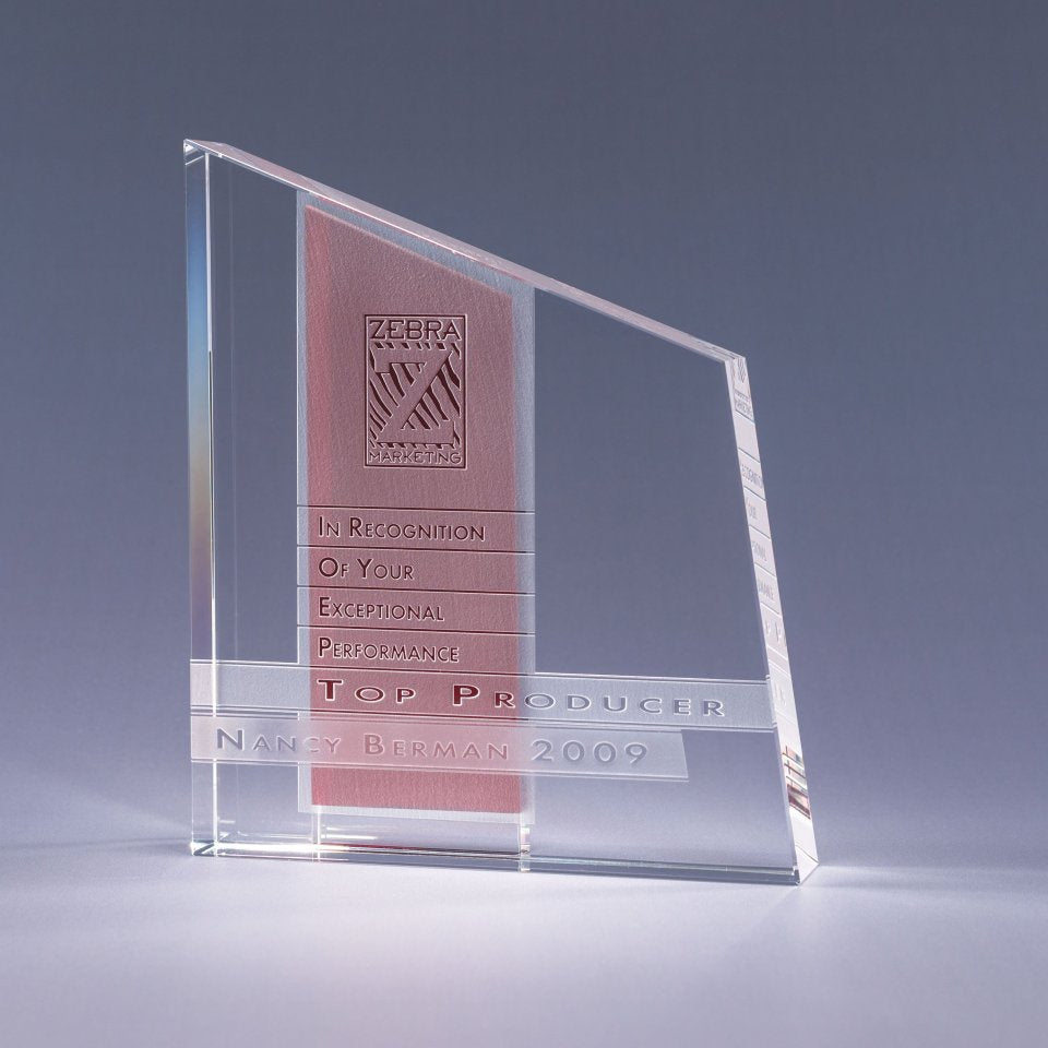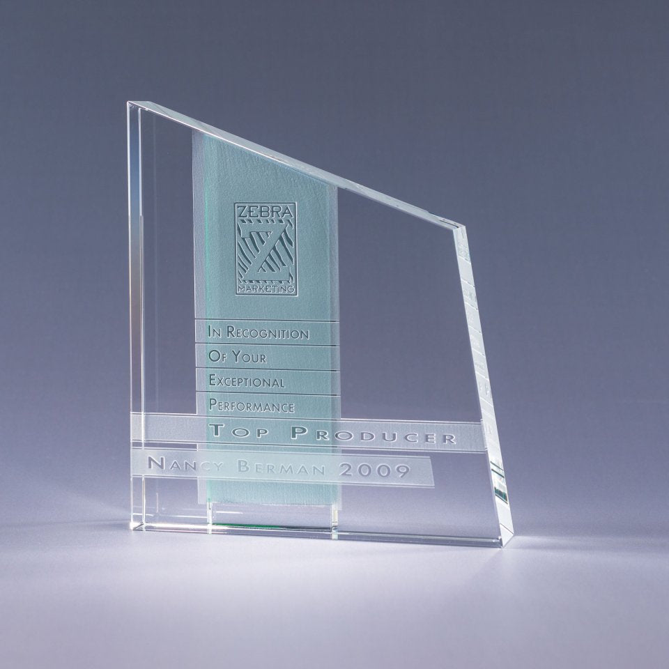 This design explores texture and color in a way that is truly original. The juxtaposition of translucent color applied against a frosted foreground creates tone on tone that adds a unique feel to your logo. Available in a variety of hues to match your corporate colors, choose: soft cobalt, soft red, soft amber, or soft green. Please specify color when ordering