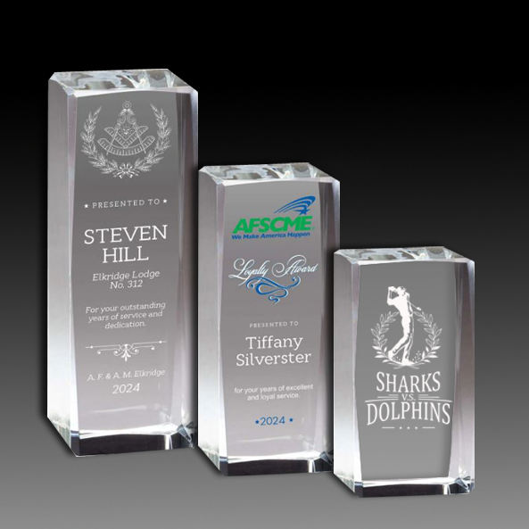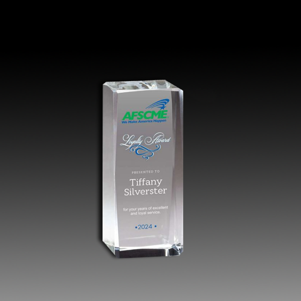 This freestanding block, optical crystal, cube shaped award is magnificent and would look stunning in any setting. You can customize this award with your logo and choice of text.