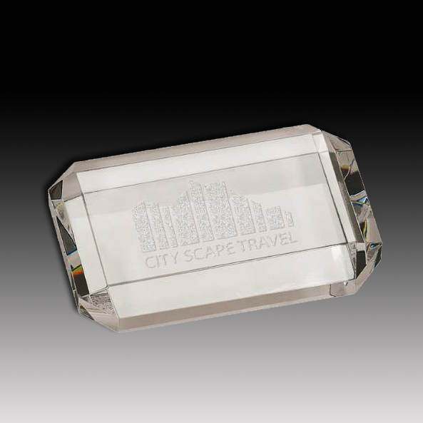 Our Premier Crystal Paperweights is handmade and may vary slightly in size. Optic crystal rectangle paperweight with clipped corners. Packaged individually in a lined gift box. Premier Crystal is the ultimate way to recognize and honor! 4" x 2.75"