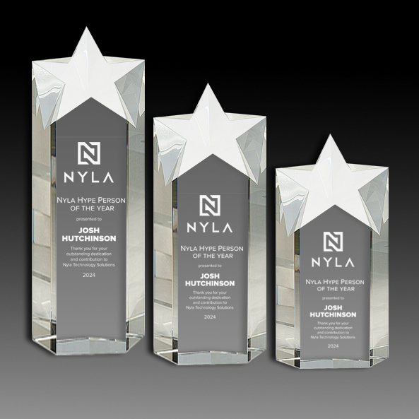 This clear crystal star stands atop of a clear crystal base, making a splendid presentation. The base provides the perfect backdrop for your text and logo. Let someone know they are a rising star.