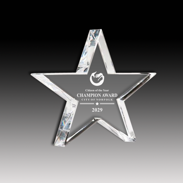 Crystal star paperweight. 7/8” thick lead-free optical crystal suitable for laser engraving or sand etching. Packaged in satin-lined, padded gift box.