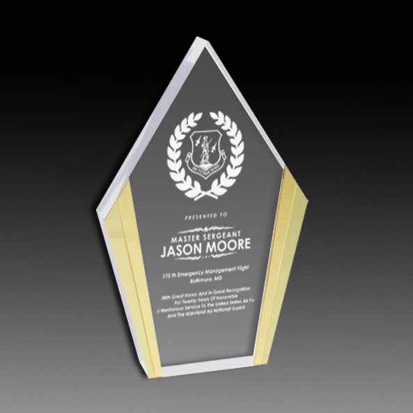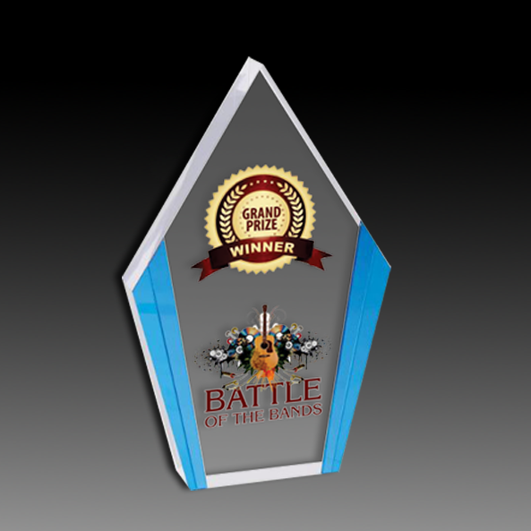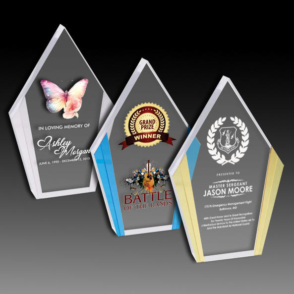 Premier Acrylic is the ultimate way to recognize and honor. Color Edge Diamond Acrylics are self-standing and 1 inch thick. The personalization area is clear with blue, gold or silver edges to add a pop of color. They are easily customizable by either UV printing or laser engraving.