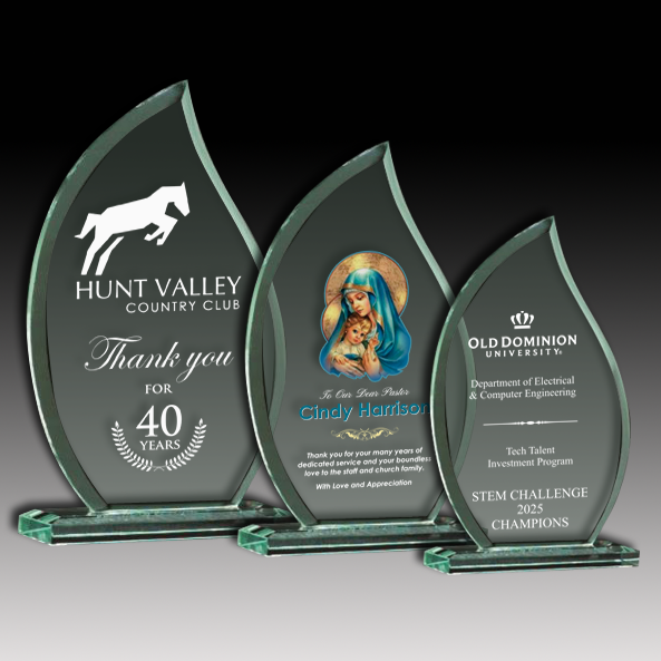 Flame Glass Award, 1/2" thick jade glass suitable for laser engraving or sandblasting. These Glass Awards are packaged in satin-lined, padded gift boxes. All Glass Awards are preassembled, bases have protective rubber feet.