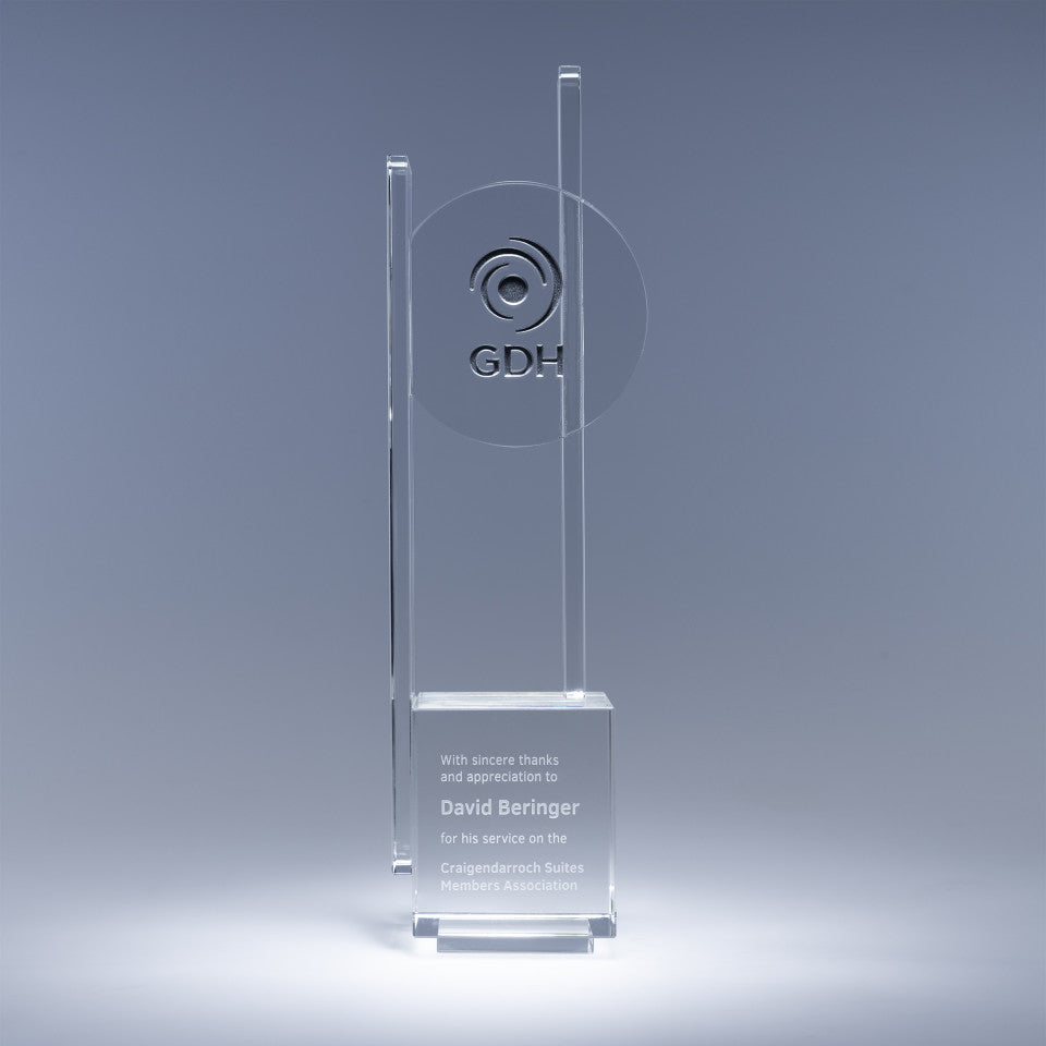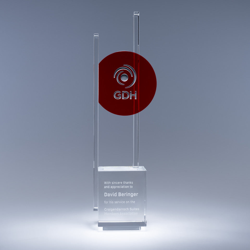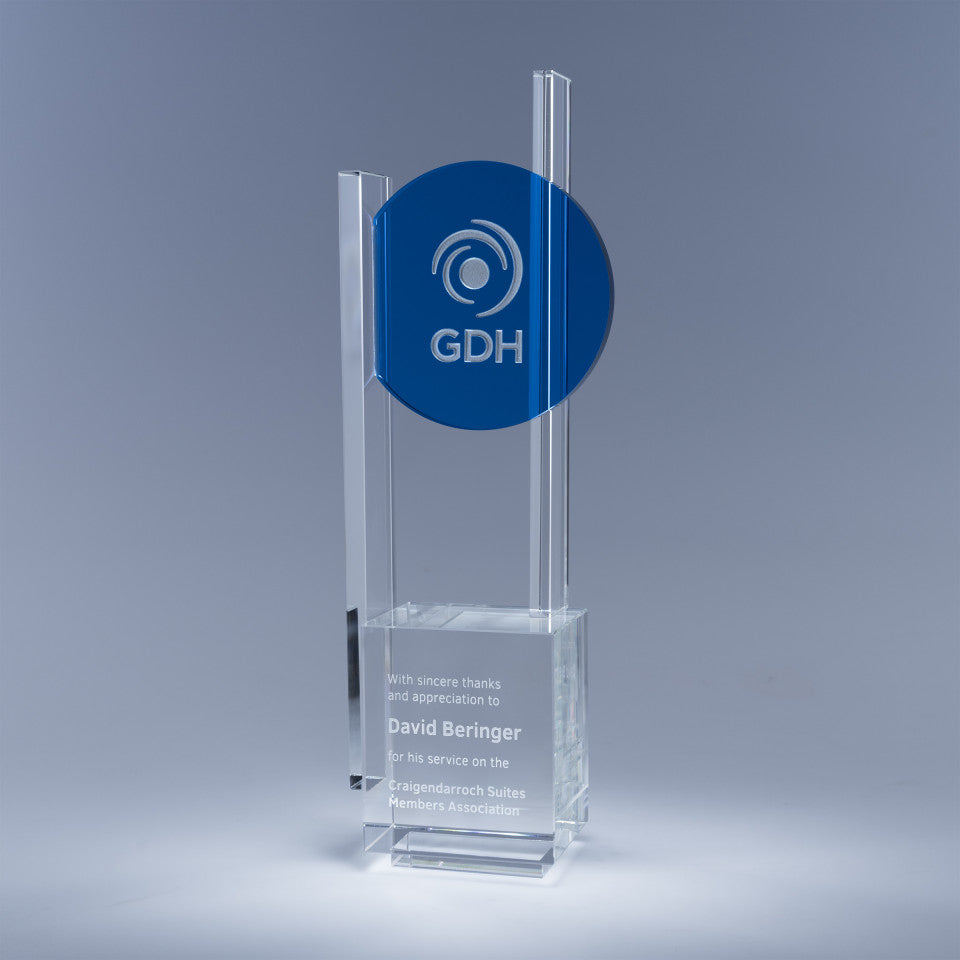 Massive achievements call of equally big recognition. This modern shape conveys good design and strength at first glance. Available with a blue, red or clear circle.