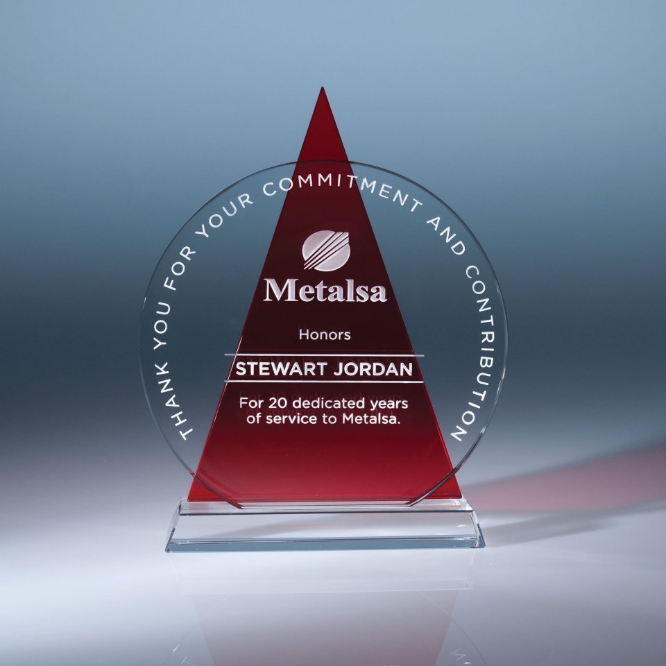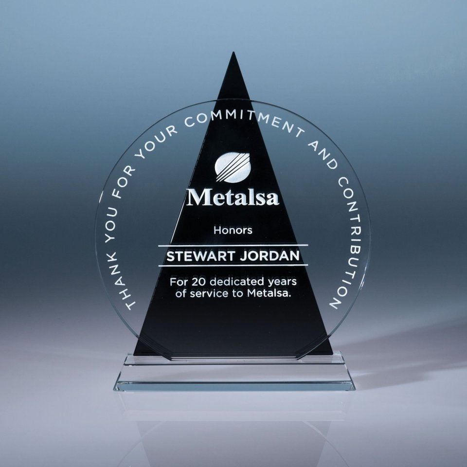 Our Icon features basic geometric shapes for a look that's contemporary while affording plenty of room for your creativity. The triangle is available in your choice of blue, red, or black creating contrast that will make your message shine from afar. All components are quality optic crystal. Secondary etching location included as shown