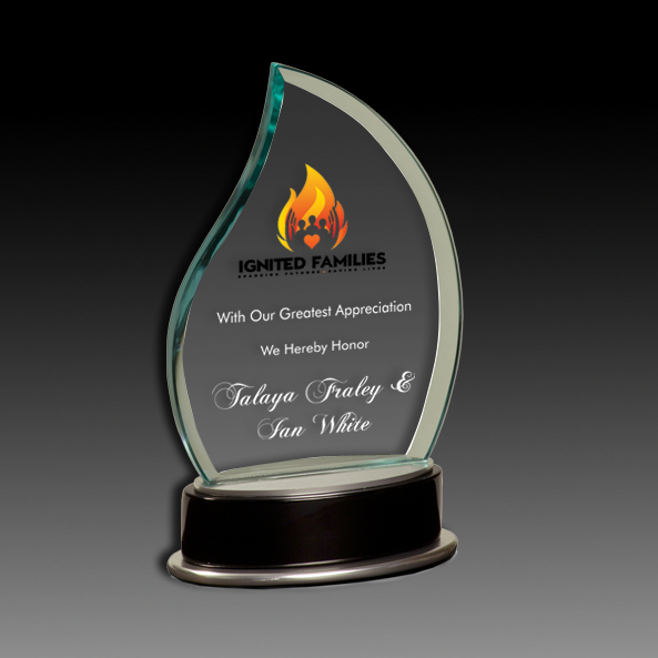 This metro glass, flame shaped award sits on a black base edged with silver highlights. This award has a classic and modern appearance that accommodates in any setting. The flame shape flows smoothly making it more appealing. Purchasing this award today showS your appreciation.