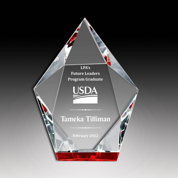 This 1.75-inch thick, clear and red, multi-faceted hexagon award is SURE to thrill your recipient! This corporate award is made of clear crystal features with a ruby red base. Available in 3 sizes.