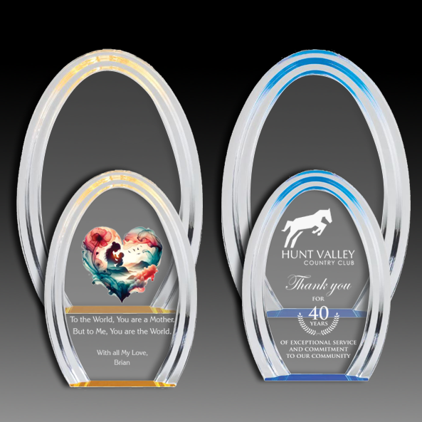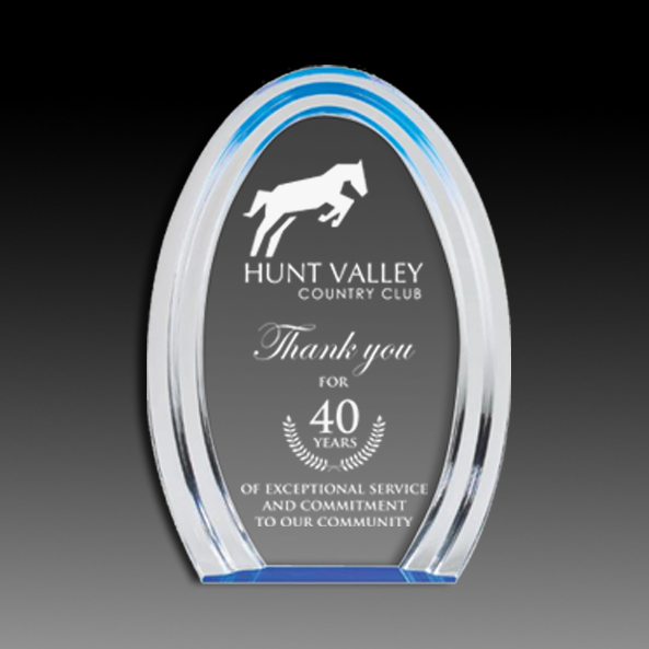 This oval acrylic award exudes durability and resilience, standing proudly without the need for a base. The double halo construction ensures it will serve as a lasting symbol of achievement, inspiring recipients for years to come. With your choice of Blue or Gold accents to complement your themes this exquisite piece is a testament to their dedication and excellence.