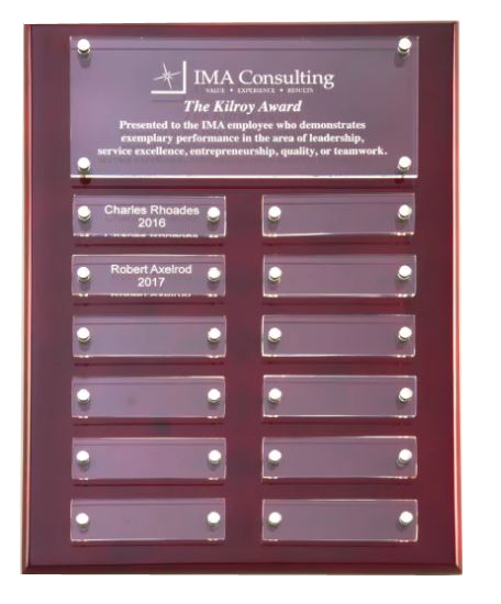 High gloss perpetual plaque with acrylic engraving plates. No tools required, plates can be changed by hand. Individual plates are 7/8" x 3-1/8". Individually boxed.