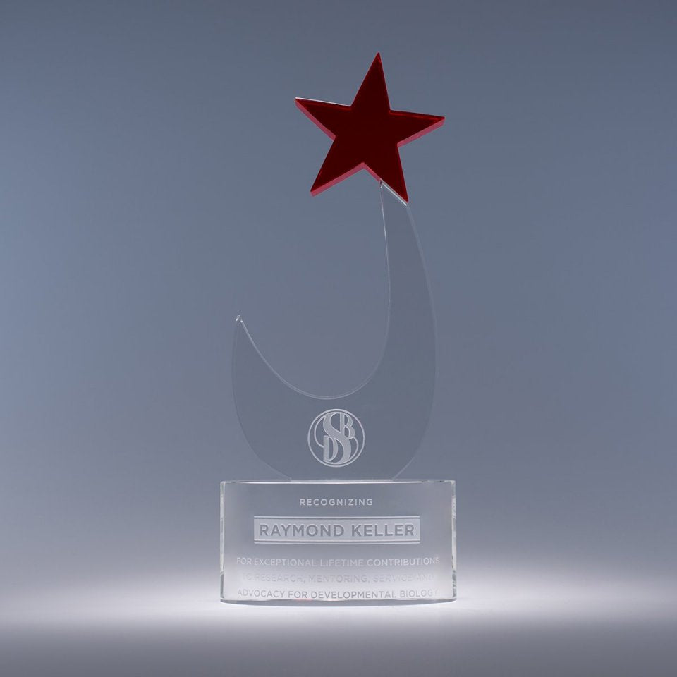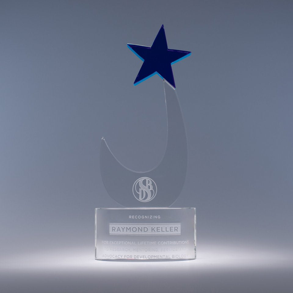 When it's important to make a splash, choose our well-designed Sensation Award. Large and hefty, this unique piece sports attention-getting curves capped by a star of your choice of blue, red, or clear.