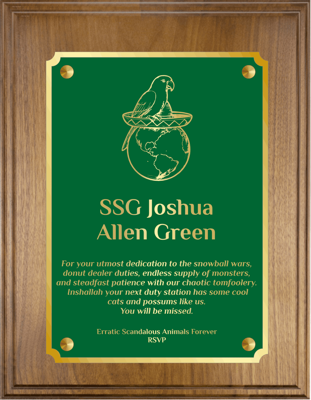 This simulated walnut plaque is good to give to someone for their achievements like retirement, sports, leadership, etc. It comes with a full sized engraving plate for your personalized text and images. It also comes in 8 different sizes 4 x 6 being the smallest and 12 x 15 being the largest. Someone will appreciate this award.